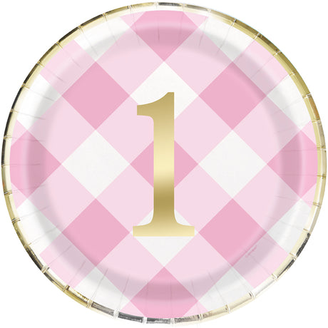 Pink Gingham 1st Birthday 9in Plates 8ct